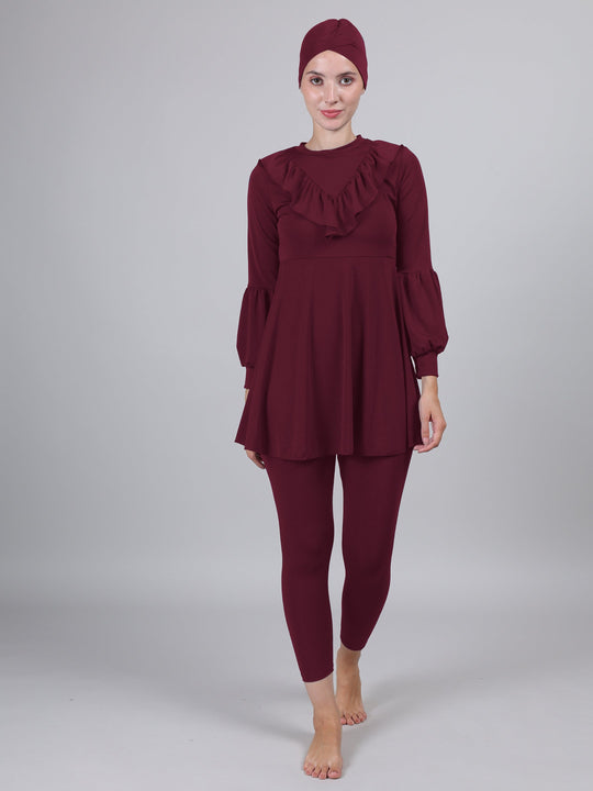 3 Piece Modest Muslim Burkini Ruffle Full Coverage Long Sleeve Removable Chest Pads Swim Hijab Swimsuit