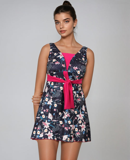DESIGN: Front knot with adjustable belt, built-in inner shorts, Printed & flared skirt design swimming costume for women shows elegance and vitality.