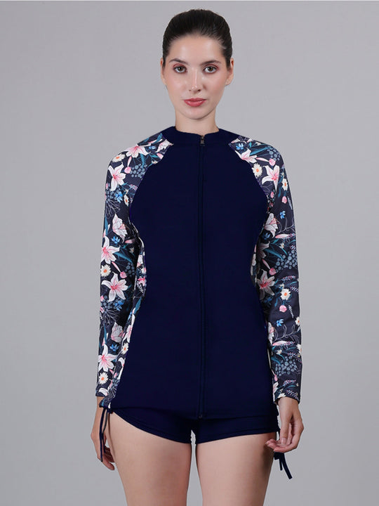 [FRONT ZIPPER DESIGN] Zipper rash guard for women is easy on/off, crew-neck rashguard top featuring printed long sleeves.