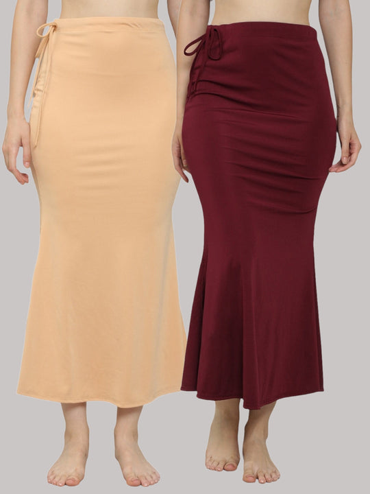 MEGASKA Women Lycra Seamless Fishcut Petticoat Skirt Saree Shapwear Combo (Pack of 2)_Beige_Wine