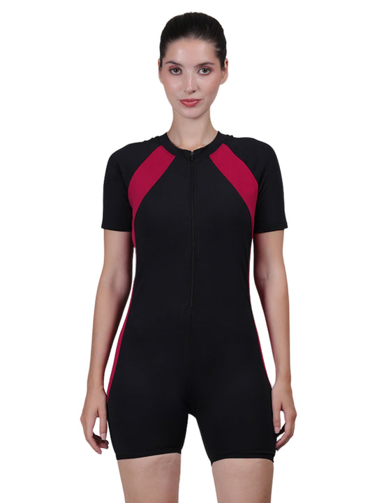 [Fashion-Forward Designs]: The short sleeve one piece swimsuit is designed with pretty Color Block print. Rash guard bathing suit women with a front zip for easy on and off. Rash guard women one piece built-in removable chest pads offers enough support.